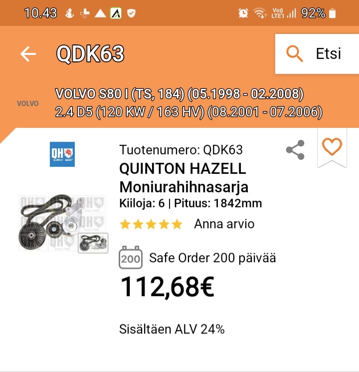 Nyt olisi myynnissä käyttämätön Volvon moniurahihnasarja. Ostettu Autodoc sarjana QDK63. Sarja ei käynyt Volvo